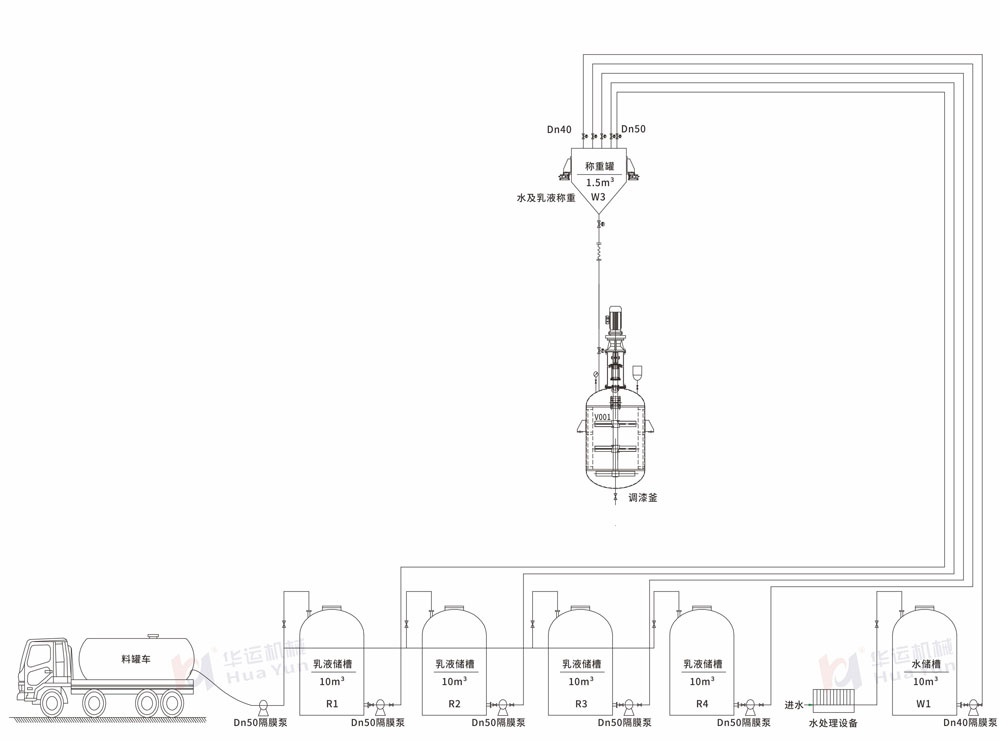 乳液由槽罐車運(yùn)輸進(jìn)入廠后通過隔膜泵打入乳液儲罐存放。