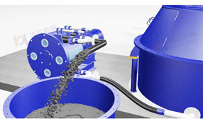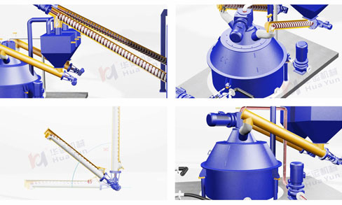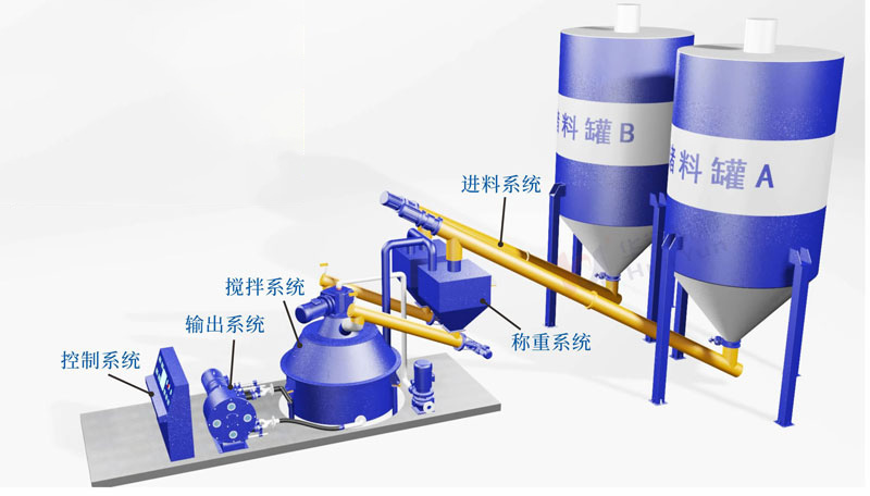進(jìn)料系統(tǒng)由多臺(tái)螺旋輸送機(jī)和稱重罐組成,通過螺旋輸送機(jī)將儲(chǔ)存罐里面的散裝水泥,粉煤灰等物料,采用螺旋輸送機(jī)定量均勻輸送到稱重罐,稱重后再輸送到特制攪拌罐進(jìn)行攪拌;